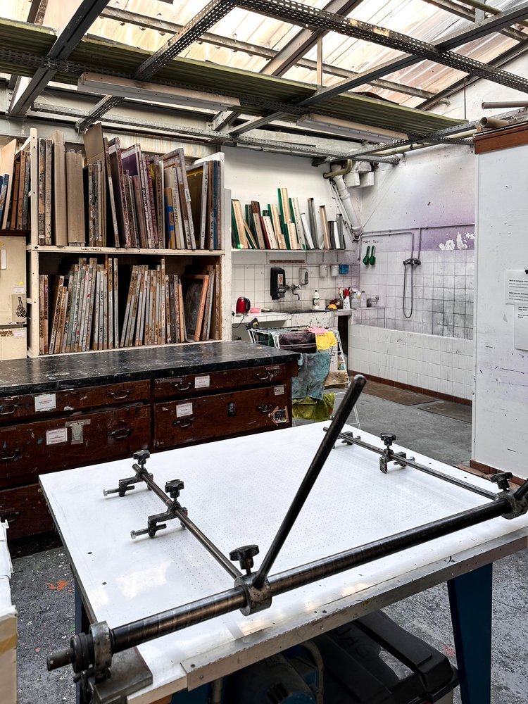 Bild överst på sidan: Konstnären Alexandra Hedbergs praktik består till stor del består av screentryck i stora format för rumsliga installationer. Under stipendievistelsen i Carina Ari-ateljén påbörjade hon verk till en utställning i Katarina kyrka, Stockholm, som visas i oktober 2025.