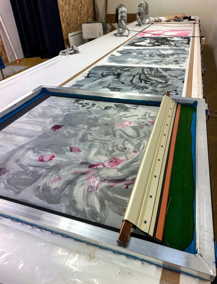 Bild överst på sidan: Konstnären Alexandra Hedbergs praktik består till stor del består av screentryck i stora format för rumsliga installationer. Under stipendievistelsen i Carina Ari-ateljén påbörjade hon verk till en utställning i Katarina kyrka, Stockholm, som visas i oktober 2025.